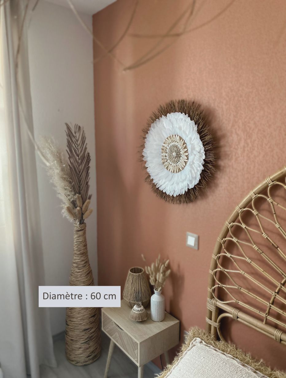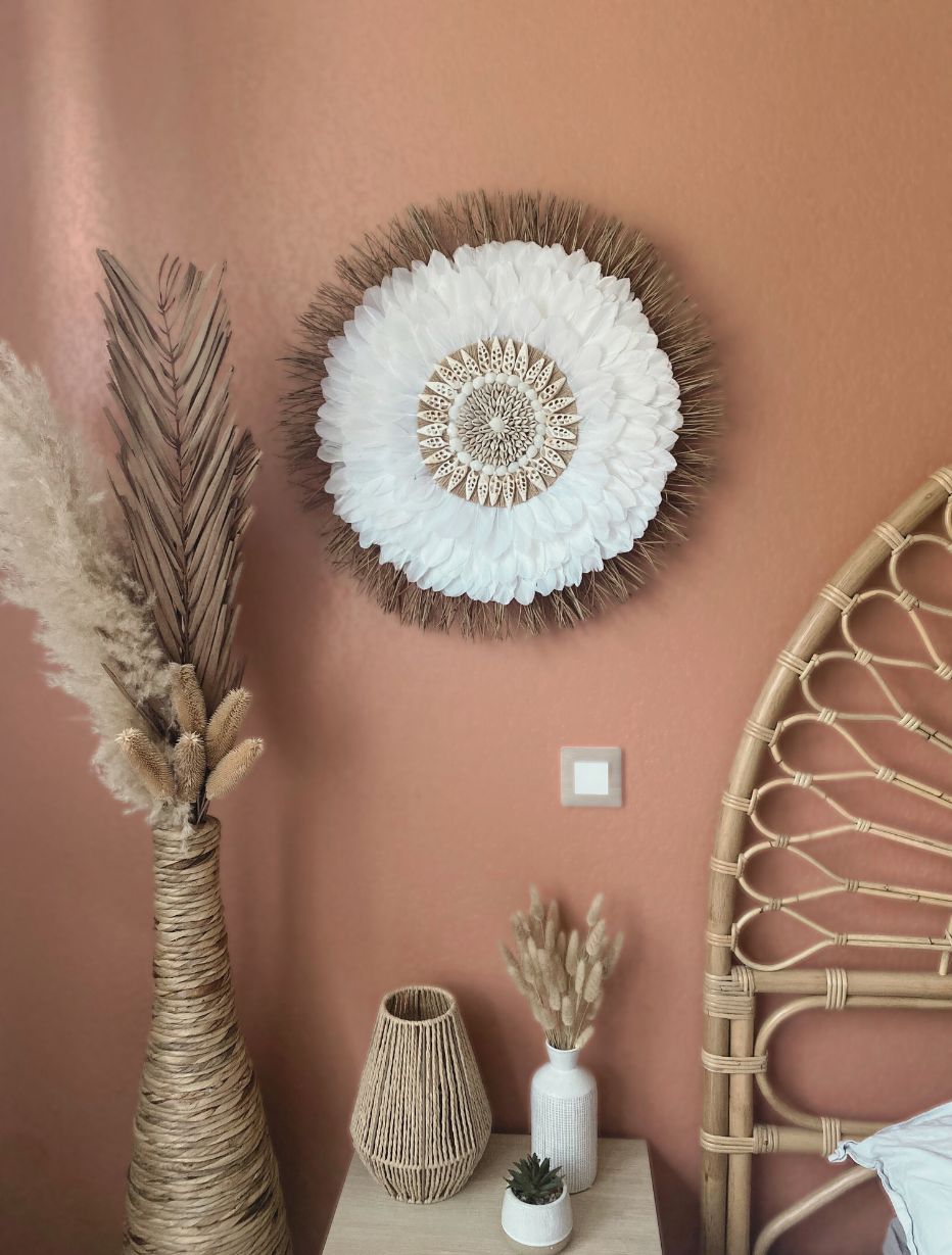 Offrez à votre maison une ambiance douce et harmonieuse avec le juju hat blanc bohème « Écume de Bali », une création artisanale inspirée de l’équilibre entre les éléments naturels. Réalisé à la main avec patience et passion, ce juju hat mêle la légèreté des plumes à la force des aiguilles de pin et à la symbolique des coquillages protecteurs. Il incarne la rencontre poétique entre la terre et l’eau, entre ancrage et légèreté.
