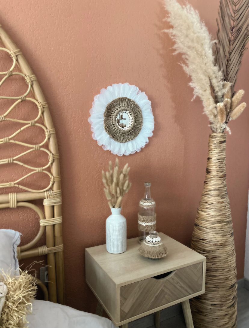 Inspirée par la douceur des lagons tropicaux, la création « Perle de Lagon » évoque le calme d’une plage sauvage au petit matin. Ce miroir juju hat bohème associe plumes d’oie, coquillages cauri et corde naturelle pour donner naissance à une pièce à la fois brute et délicate. Réalisée à la main avec soin, elle apporte à votre petit cocon un esprit authentique, doux et solaire.